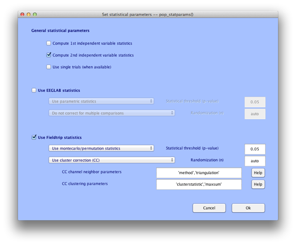 Thank you for the comment again. I undone the changes, but the same error message appears. The cluster-based permutation test works well for ERP, but it doesn't work for ERSP. Attached is the window of EEGLAB for statistic parameters. I understand you are not familiar with EEGLAB. Could you give me any suggestions for the parameters of FieldTrip statistics? The messages in the command window of Matlab is as follows.