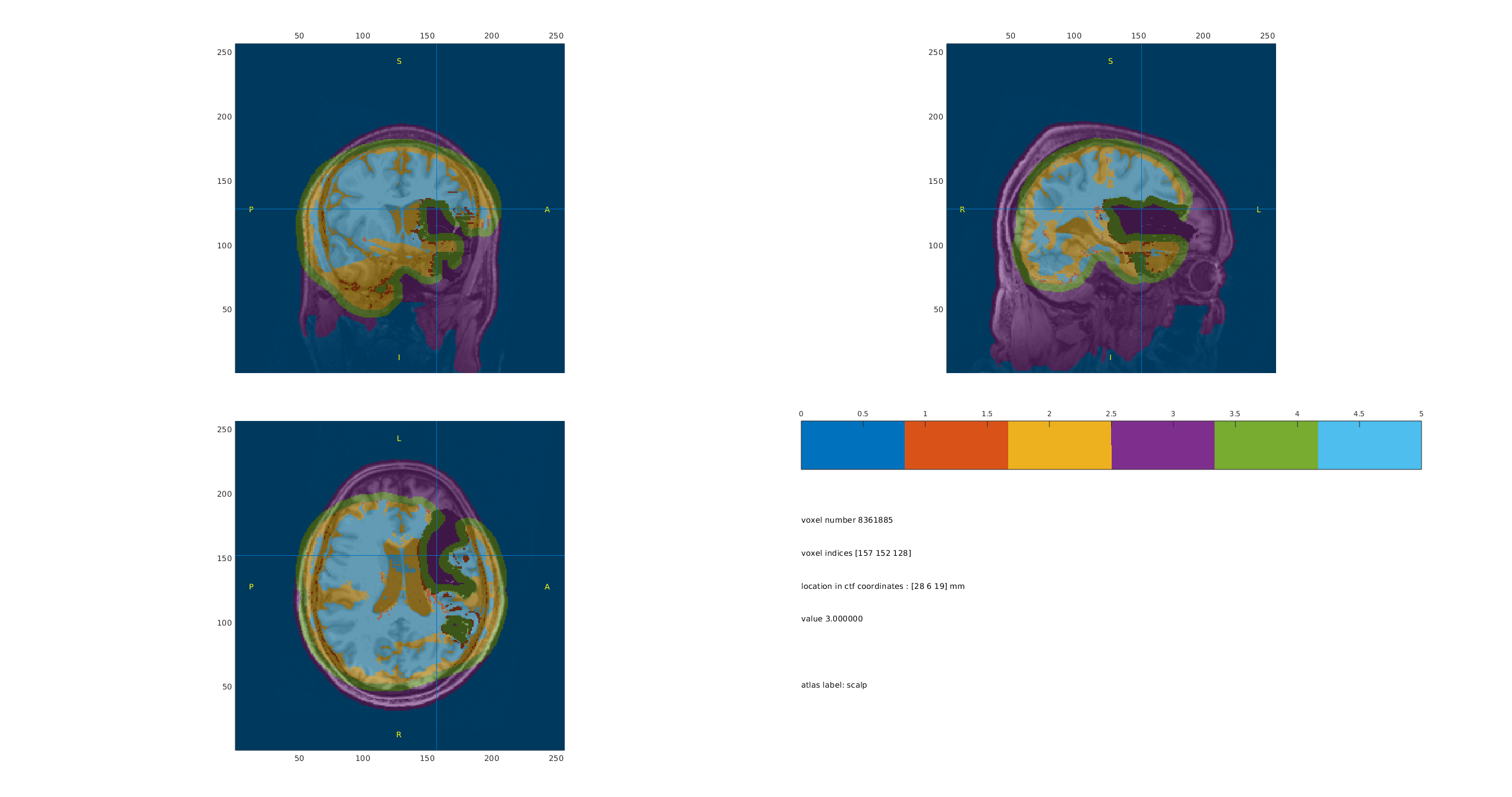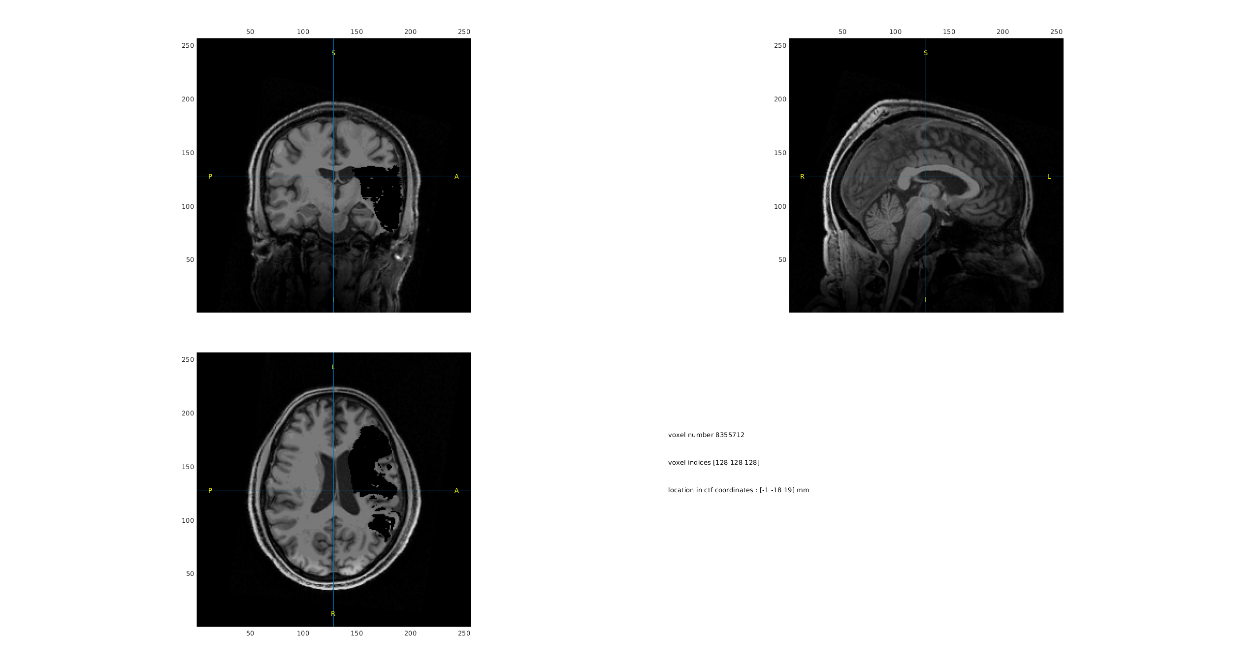 Regarding the segmentation: we actually already have an MRI image where the lesion area has been masked with zero intensity values. When running an indexed segmentation (`ft_volumesegment`) on this image, we observed that the lesion is most often misclassified as scalp or skull tissue (ref. to the joint images).